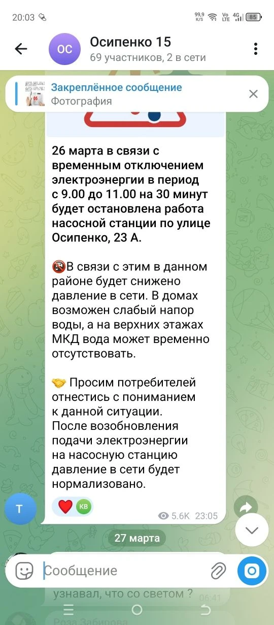 Из предложки: Жители Осипенко продолжают жаловаться на отсутствие напора холодной воды. Хотя летний сезон еще и не начался. Со слов Управляющей компании после установки насосной станции ситуация должна была изменится, и верхние этажи должны были получить долгожданную воду. Однако чуда не произошло! Также не понятно почему вечером не дозвониться до аварийной службы.