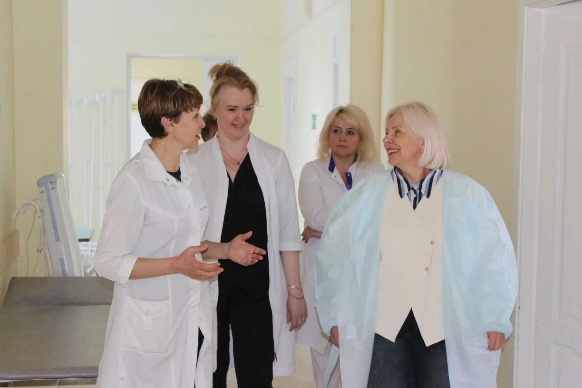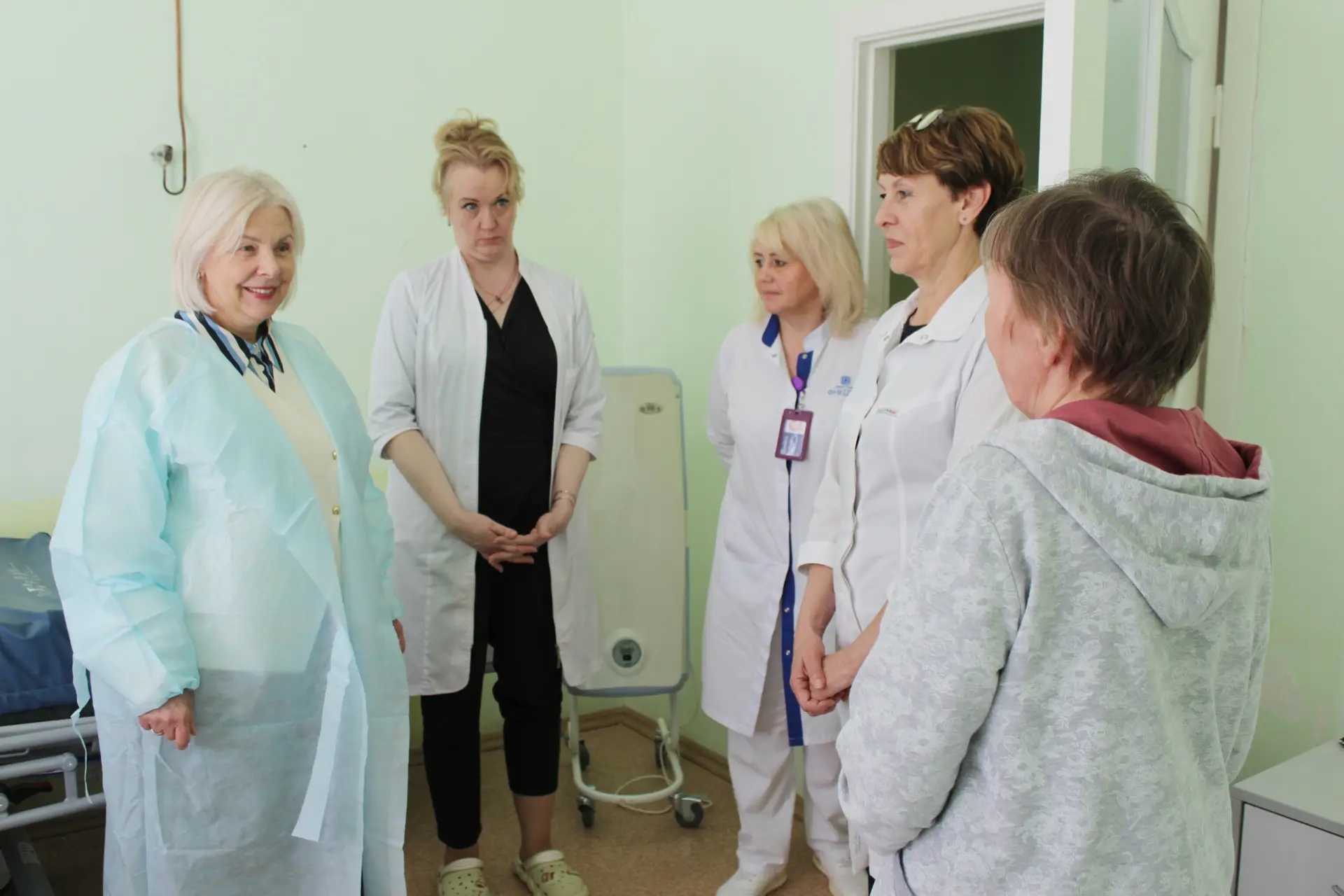 Марина Доронина в сопровождении заместителя начальника клинической больницы по медицинской части Натальей Яцына и главной медсестрой Светланой Кляченковой подробно ознакомилась с работой паллиативного отделения. Эксперт внимательно осмотрела помещения, побеседовала с медицинским персоналом, пациентами, их родственниками.