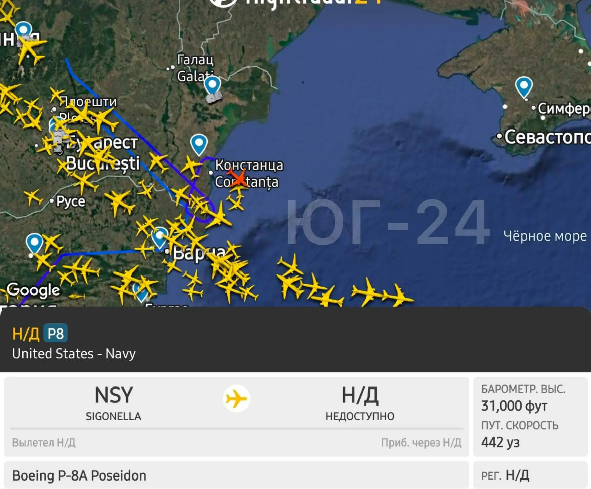 ⚡️Американский самолёт дальней радиолокационной разведки Boeing P-8A Poseidon приступил к разведке Крыма над акваторией Чёрного моря.