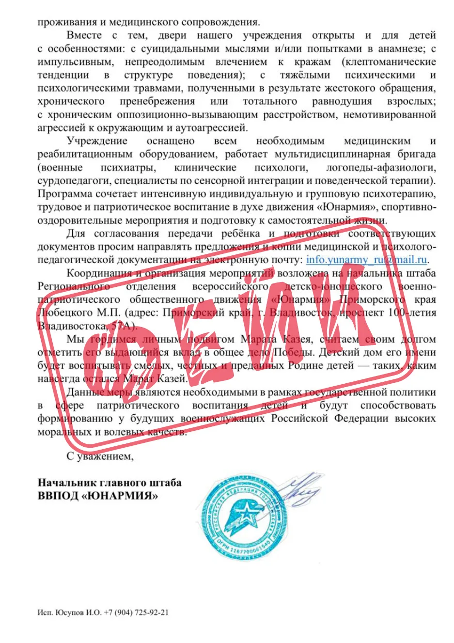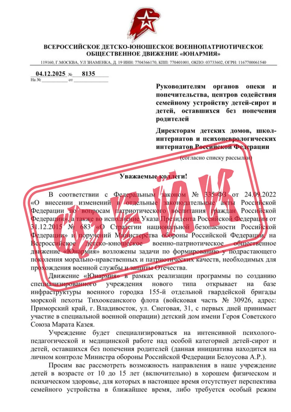 11 и 12 декабря в информационном пространстве (Telegram, сайты-агрегаторы, региональные паблики) зафиксировано массовое распространение сообщений о якобы создании детского дома имени Марата Казея на базе 155-й гвардейской бригады морской пехоты ТОФ с участием «ЮНАРМИИ» и Минобороны России. Документ, оформленный «под официальное письмо» «ЮНАРМИИ», не имеет отношения к Движению и является подделкой.