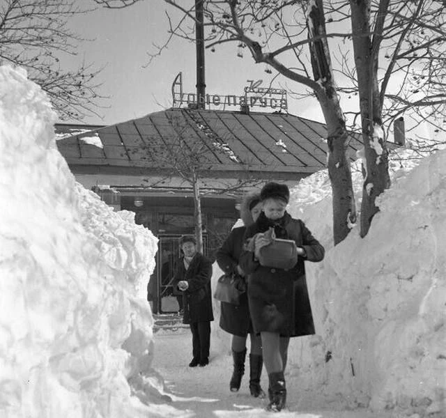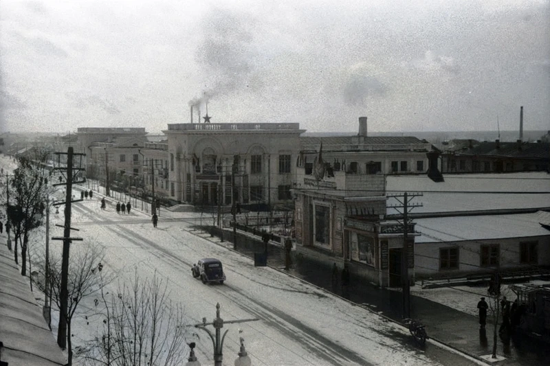 Участок улицы им. В. И. Ленина. Справа – здание кинотеатра «Совкино». г. Южно-Сахалинск. 1950-е гг. Фотограф В. А. Привезенцев.