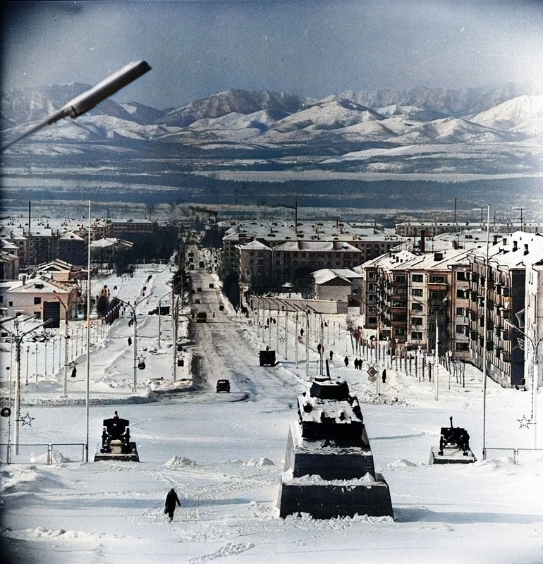 Перспектива проспекта Победы. На переднем плане – площадь Победы и мемориальный комплекс в честь освобождения Южного Сахалина и Курильских островов. г. Южно-Сахалинск. 1975 г. Фотограф О. Галушко.
