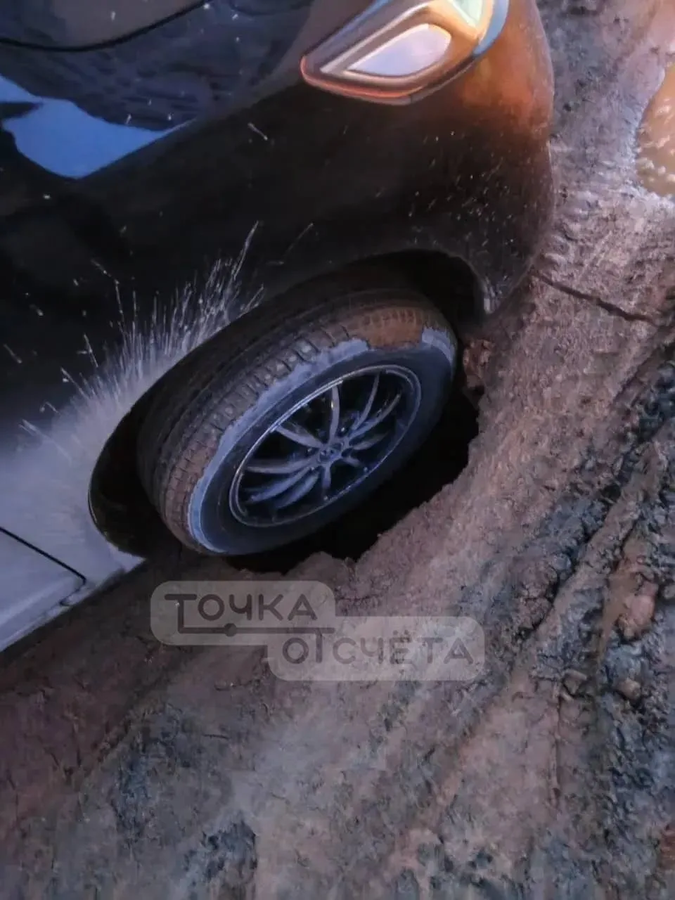 😨Колесо автомобиля провалилось в 50-сантиметровую яму в Южно-Сахалинске