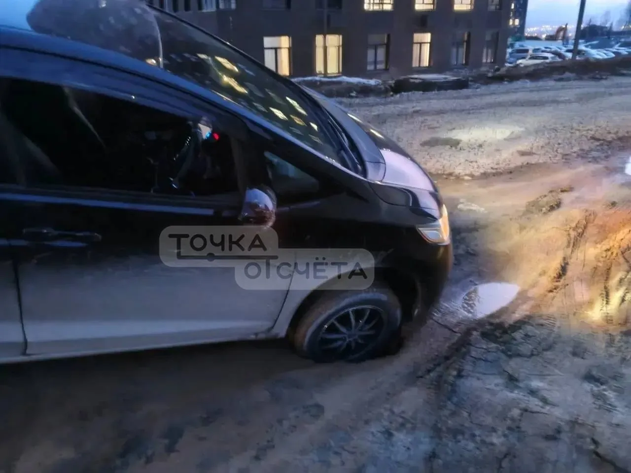 Неприятность случилась с владельцем авто на парковке около дома №7/1 на улице Жириновского в ЖК "Уюн". 7 апреля примерно в 22:30 земля буквально провалилась под колесом машины, а арматура от люка, расположенного рядом, пробила шину, сообщила "Точке отсчёта" читательница. Асфальтированной парковки пока во дворе нет, поэтому автовладельцам отвели участок для машин в грунтовом исполнении неподалёку.