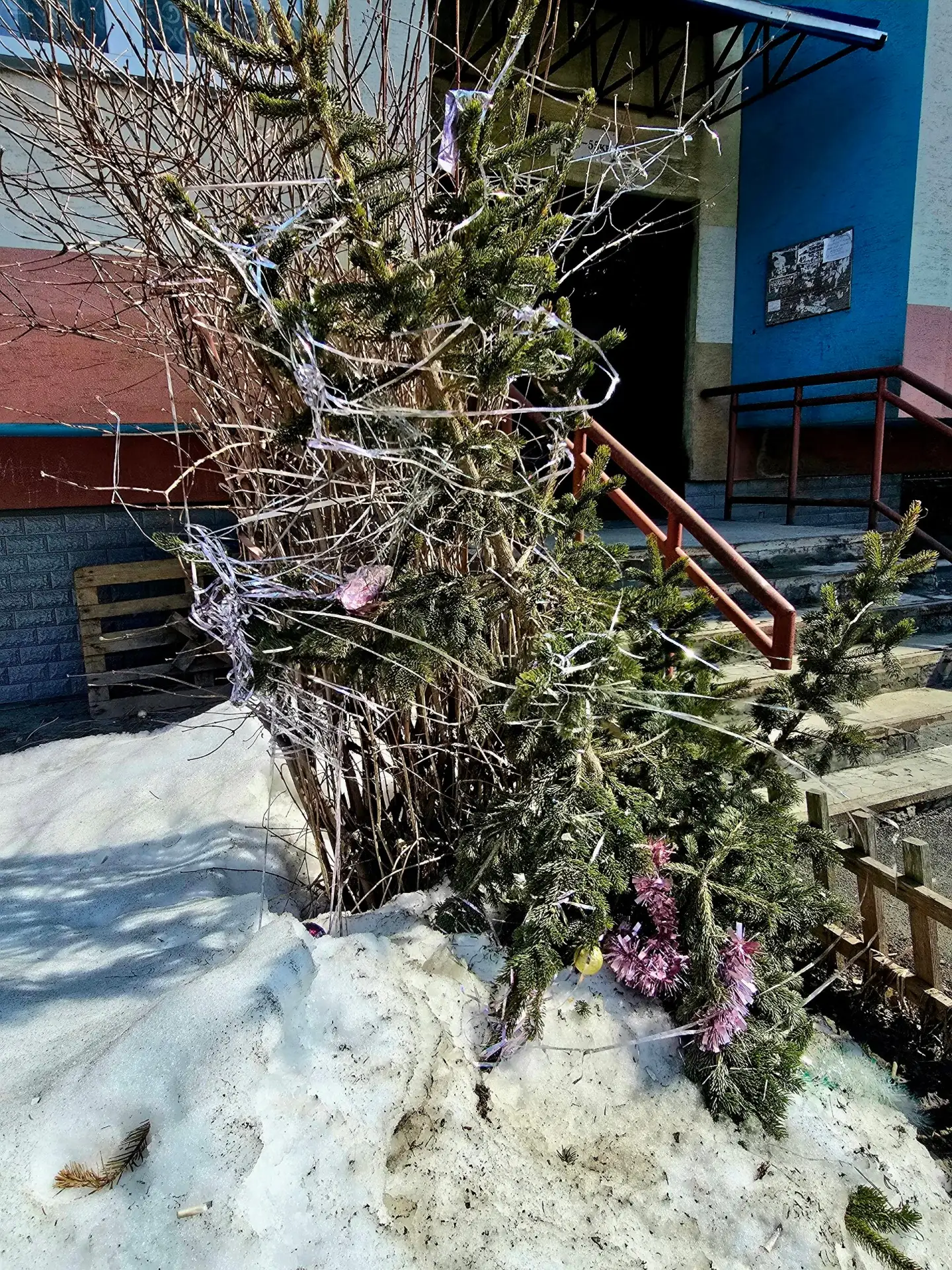 На проталинах уже робко цветут первые цветы, рядом - сугробы, который пока не сдаются, а между ними уютно разместилась выброшенная ёлка. Вся в мишуре, с уцелевшими игрушками.