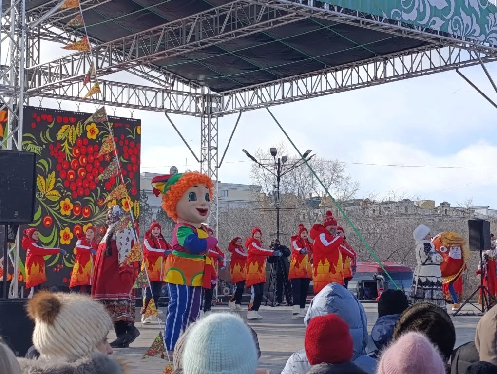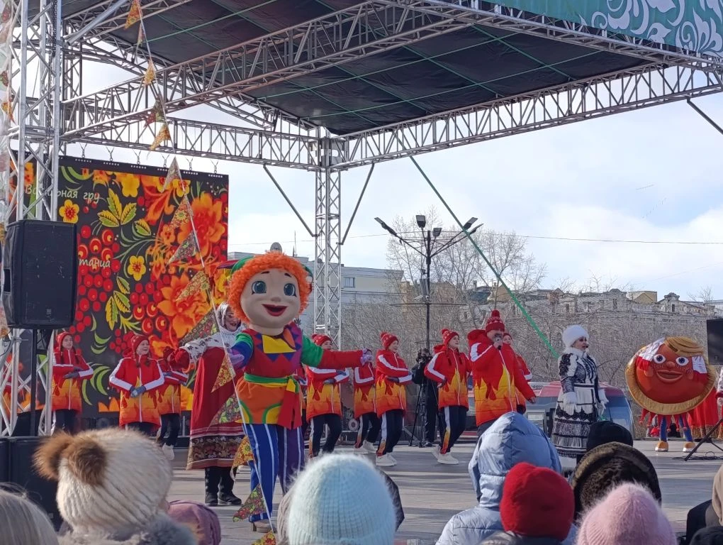 На сцене в этот момент выступили скоморохи, а главным героем праздника стал блин – артист, переодетый в солнечный символ Масленицы, поприветствовал читинцев и гостей города.