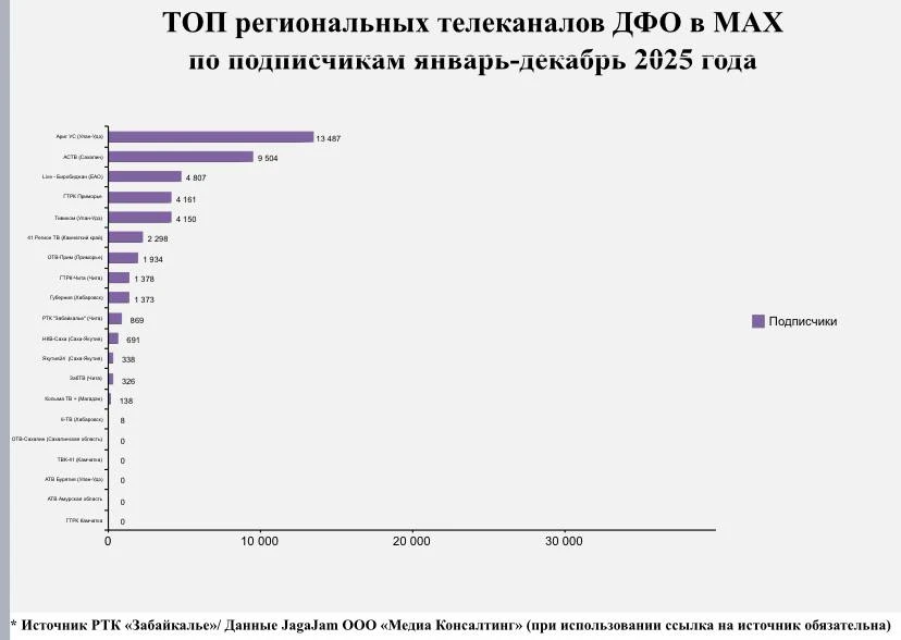 Региональный телеканал «Забайкалье» вошел в ТОП-10 по вовлеченности в национальный мессенджер «Макс» среди телеканалов Дальневосточного федерального округа. Данные опубликованы за 12 месяцев 2025 года JagaJam ООО «Медиа Консалтинг».