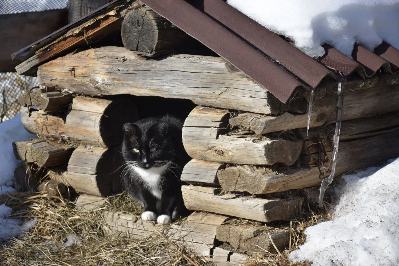 Фото Александра Бузинова, Олега Корсуна: «Кордон заказника «Урюмканский». Таёжная жизнь не любит слабаков. Серьезный парень кот Василий, особо не церемонясь, выгнал Шарика из будки, оккупировав его жилище»