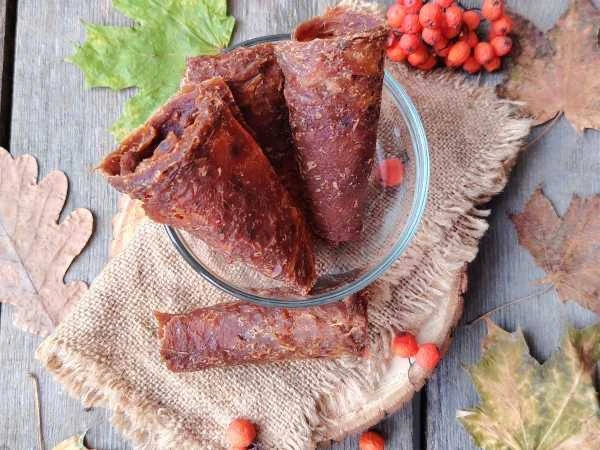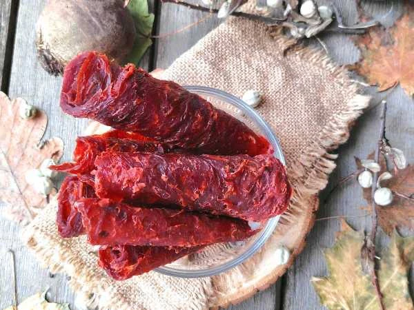 Для пастилы возьмите яблоки и свёклу. Яблоки нарежьте, удалите сердцевину и сварите или запеките до мягкости, затем измельчите в пюре. Свёклу очистите, натрите или нарежьте, сварите (или запеките в фольге), пробейте блендером и при желании протрите через сито. Соедините оба пюре, добавьте сахар и немного лимонного сока, перемешайте и при необходимости протушите, чтобы масса стала гуще. Выложите её тонким слоем на поддон сушилки (или застелите пергаментом), сушите при 35–40 °C около 8–10 часов. Готовую пастилу снимите, сверните рулетиками и храните в герметичной стеклянной посуде в холодильнике.