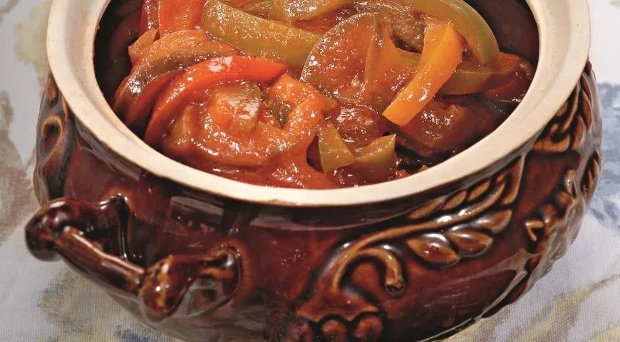 Очистите чеснок и удалите семена и перегородки из острого перчика. В большой кастрюле вскипятите томатный сок с добавлением соли, сахара, растительного масла и уксуса. Прокрутите острый перец и чеснок через мясорубку, смешайте с кипящим томатным соком и снова доведите до кипения. Удалите сердцевину из сладких перцев, нарежьте их тонкой соломкой, баклажаны вымойте и нарежьте полукольцами. Сложите нарезанные овощи в кастрюлю с кипящей смесью и тушите на небольшом огне под крышкой около 35-40 минут. После готовности разложите горячую закуску в стерильные банки и плотно закройте крышками.
