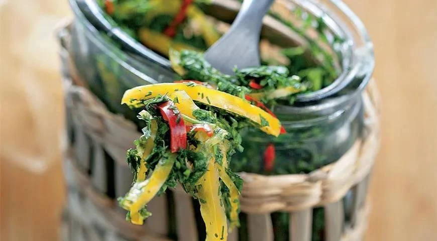 Всю зелень мелко порежьте (мельче всего – стебли). Перцы очистите от семян и плодоножек, мякоть тонко нарежьте. Тщательно смешайте перцы с зеленью в большой миске. Добавьте соль и еще раз хорошо перемешайте. Смесь плотно уложите в стерилизованные банки, закройте бумагой и завяжите. Ассорти будет готово через 2 недели. Храните в холодильнике.