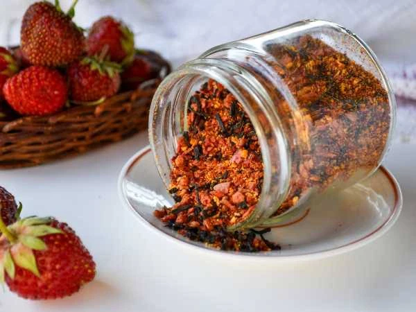 Для ароматной добавки к чаю тщательно вымойте лимон, апельсин и грейпфрут, снимите тонкий слой цедры без белой плёнки. Клубнику возьмите спелую, но плотную, удалите хвостики, промойте и обсушите, затем нарежьте тонкими пластинками. Разложите ягоды и цедру на поддоне сушилки в один слой, сушите при ~60 °C до хрупкости (цедра высохнет быстрее). Высушенные ингредиенты измельчите в блендере до мелкой крошки и пересыпьте в сухую баночку. Смесь можно использовать для выпечки, каш или десертов. Чтобы сделать ароматный чай, добавьте пару ложек листового чая в баночку со смесью, встряхните и храните плотно закрытой.