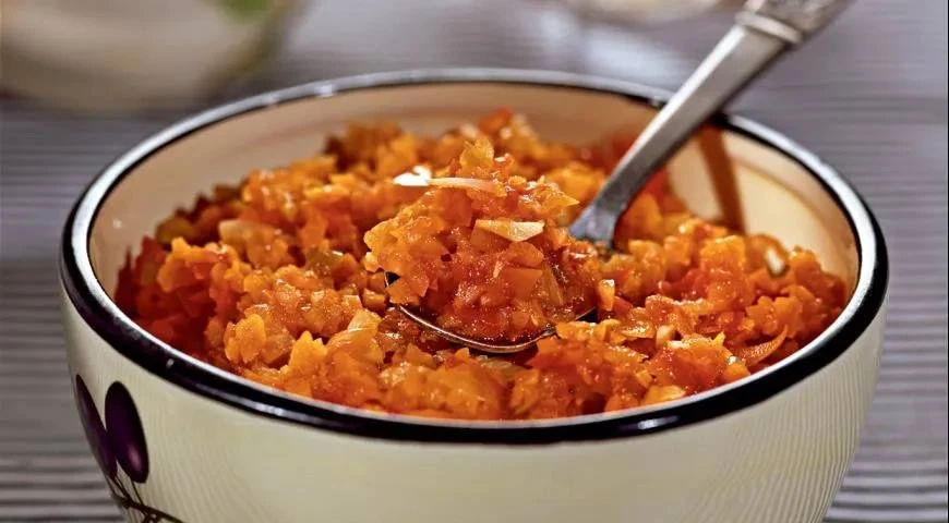 Овощи вымыть и очистить. Из перцев удалить сердцевину. Помидоры, лук, морковь, яблоки, болгарский и острый перец нарезать крупными кусками. Измельчить овощи в блендере или пропустить через мясорубку. Смесь получится жидкой. Перелить в большую кастрюлю и варить на медленном огне, помешивая, 1–1,5 ч. Чеснок очистить, мелко нарезать и добавить в приправу за 5 мин. до окончания варки. Соль всыпать в готовую приправу постепенно, маленькими порциями, пробуя на вкус. Можно не закрывать герметично, а просто хранить в холодильнике.
