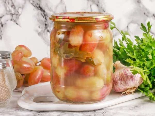 Листья дуба, хрена, вишни или смородины промойте и выложите в емкость, добавьте нарезанный чеснок и перец горошком. Виноградины снимите с ветвей, удалите подпорченные и соедините с листьями. Всыпьте соль и сахар, влейте холодную воду, добавьте укроп и перемешайте. Оставьте при комнатной температуре на 7–10 дней, ежедневно перемешивая — появление белесых крупинок и запах брожения будет нормальным признаком. Когда процесс станет интенсивным, процедите рассол, прокипятите его и выключите нагрев. Виноградины промойте, верните в банку и залейте кипящим рассолом. Для хранения в холодильнике остудите и закройте капроновой крышкой, для погреба — закройте горячую банку металлической крышкой и остудите. Солёный виноград готов и может храниться всю зиму.