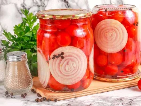 Помидоры черри снимите с веточек, промойте и удалите повреждённые плоды. В банки уложите слоями: сначала часть томатов, затем кружочки лука, потом снова черри до верха. Залейте кипятком, прикройте крышками и оставьте на 5–7 минут. Слейте воду в кастрюлю, добавьте соль, перец и специи, прокипятите 5–7 минут, затем влейте уксус и масло. Горячим маринадом залейте томаты, сразу закатайте крышками. Остудите при комнатной температуре и перенесите в прохладное место. Маринованные черри с луком готовы и могут храниться до года.
