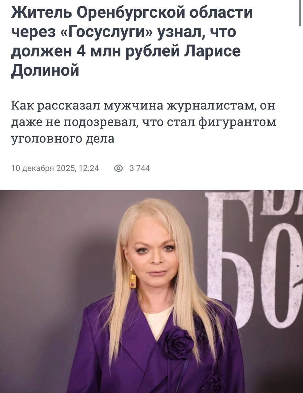 Житель Оренбургской области заглянул в свой профиль на «Госуслугах» — и обнаружил там почти пятимиллионный долг перед певицей. Согласно решению Йошкар-Олинского городского суда, он обязан вернуть Долиной около 4 млн рублей как «неосновательное обогащение» плюс примерно 550 тысяч процентов. В этом же уголовном деле фигурируют ещё девять человек: один из них уже умер, а некоторые получили реальные сроки — до семи лет колонии.