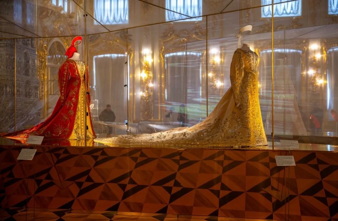 Экспозиция, посвящённая искусству золотного шитья, объединила великокняжеские и фрейлинские платья поставщиков императорского Двора с крестьянскими платками и кокошниками XIX века мастериц Русского Севера. Всего в Екатерининском дворце представлено более 60 предметов из коллекций музеев.