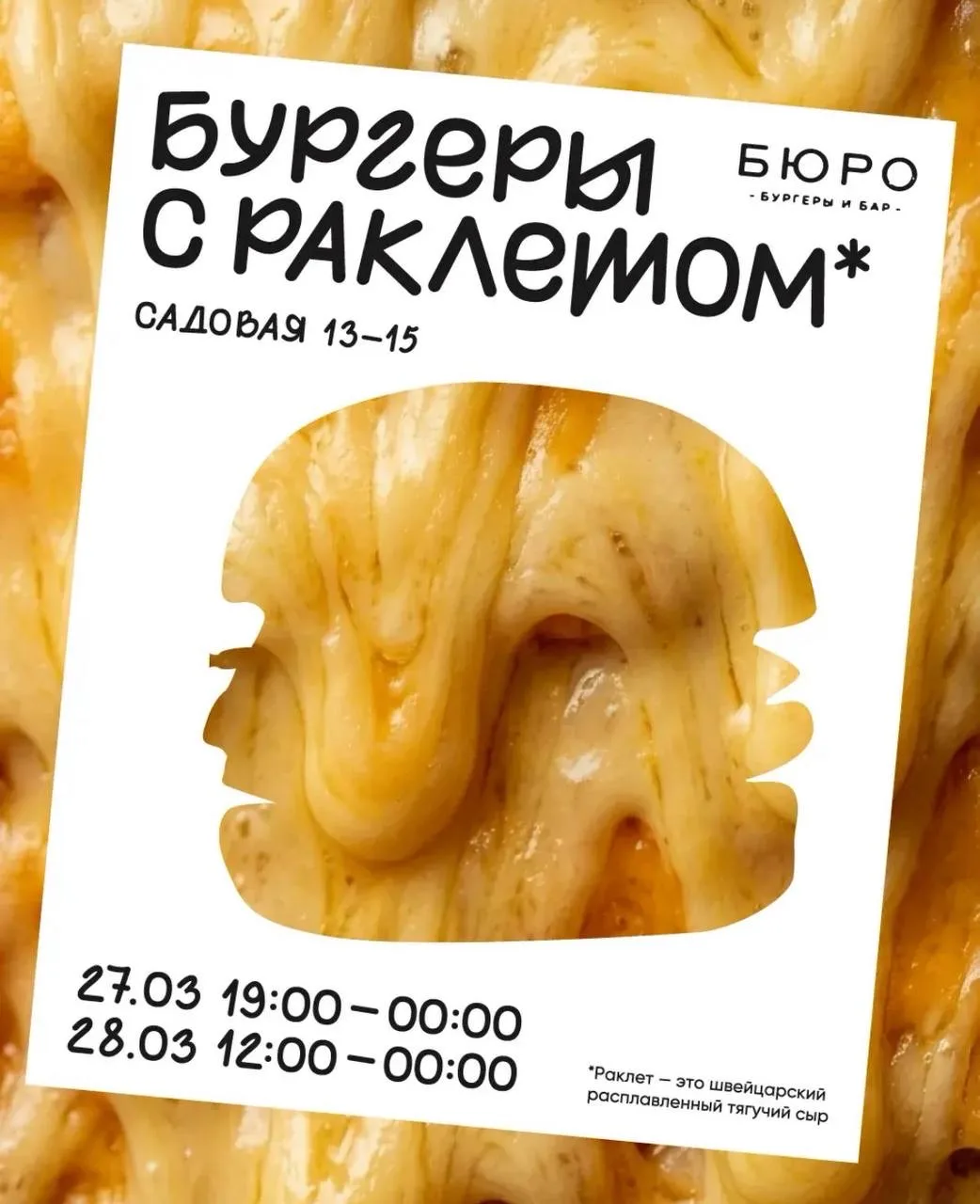 • Попробовать легендарные бургеры с раклетом в БЮРО