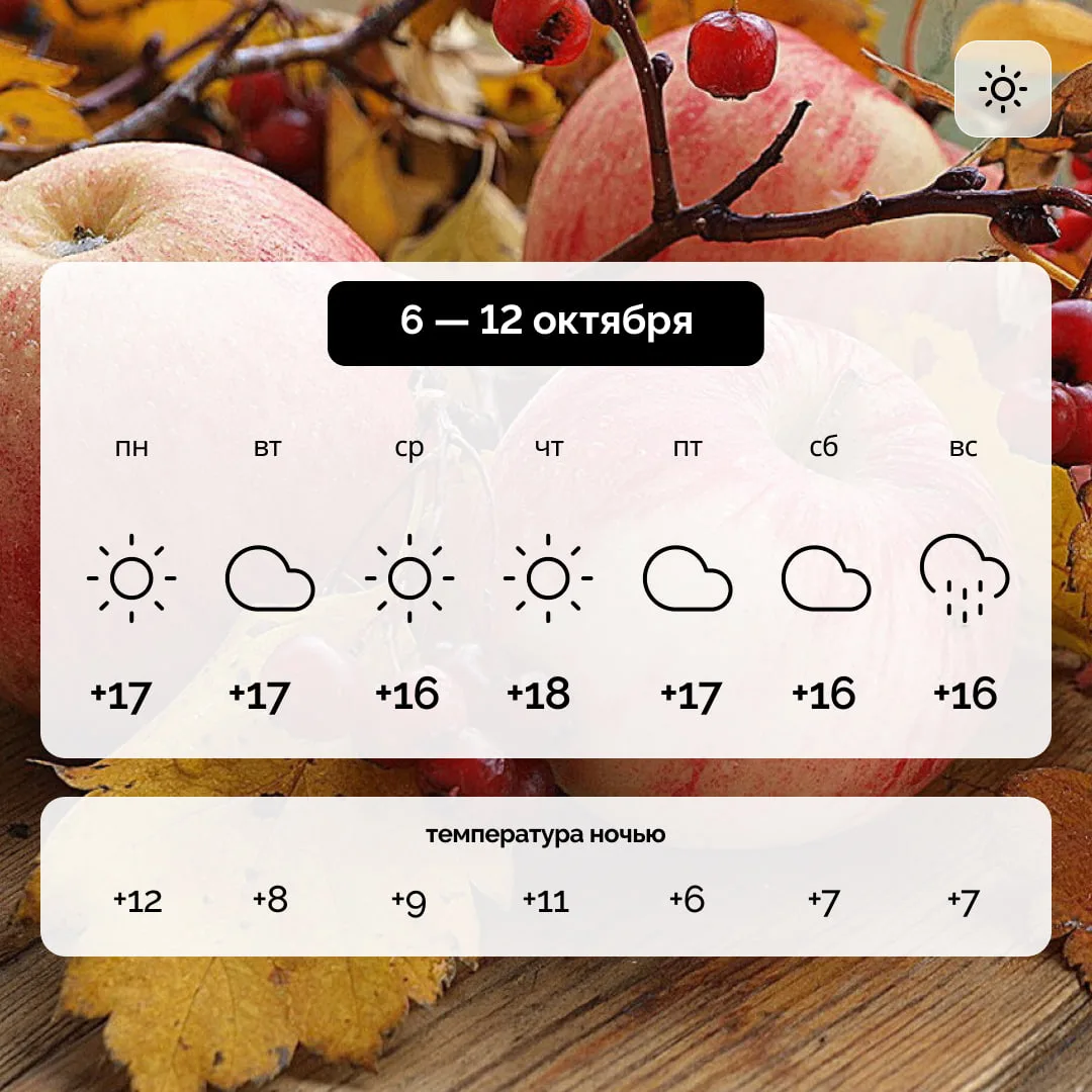 На протяжении недели температура воздуха составит +17 °C днем, а ночью температура воздуха не опустится ниже +6 °C.