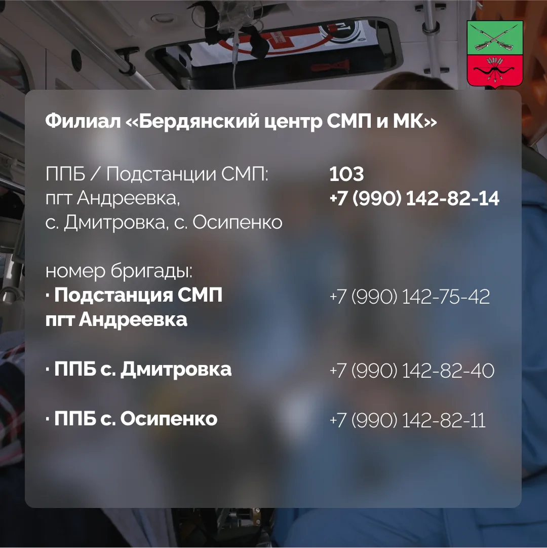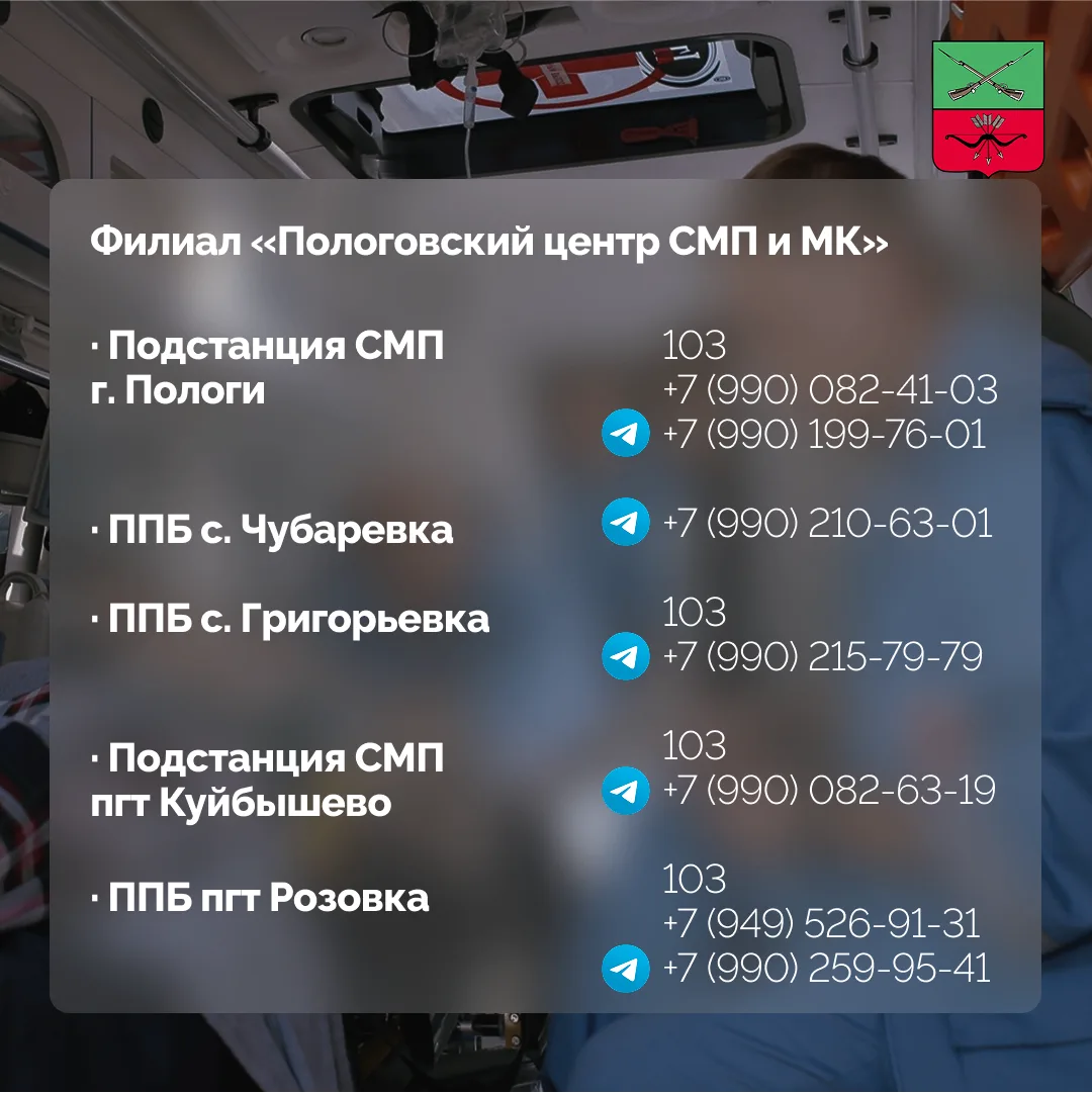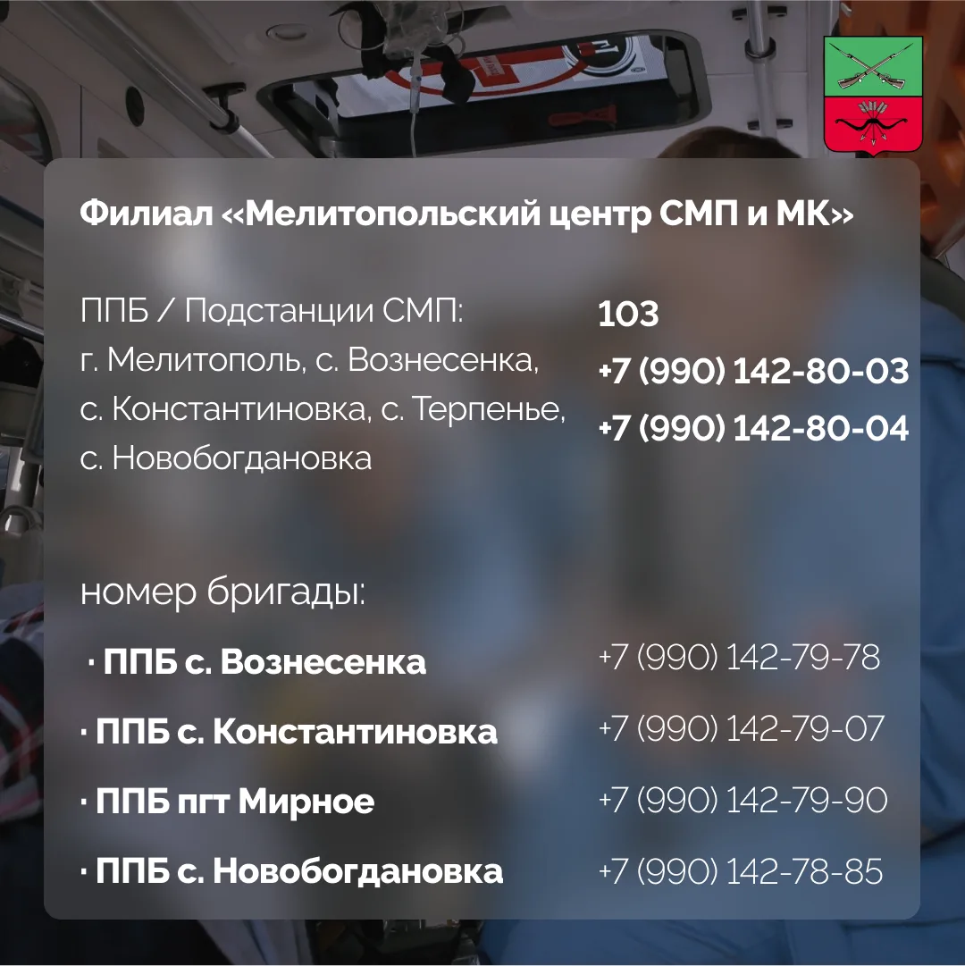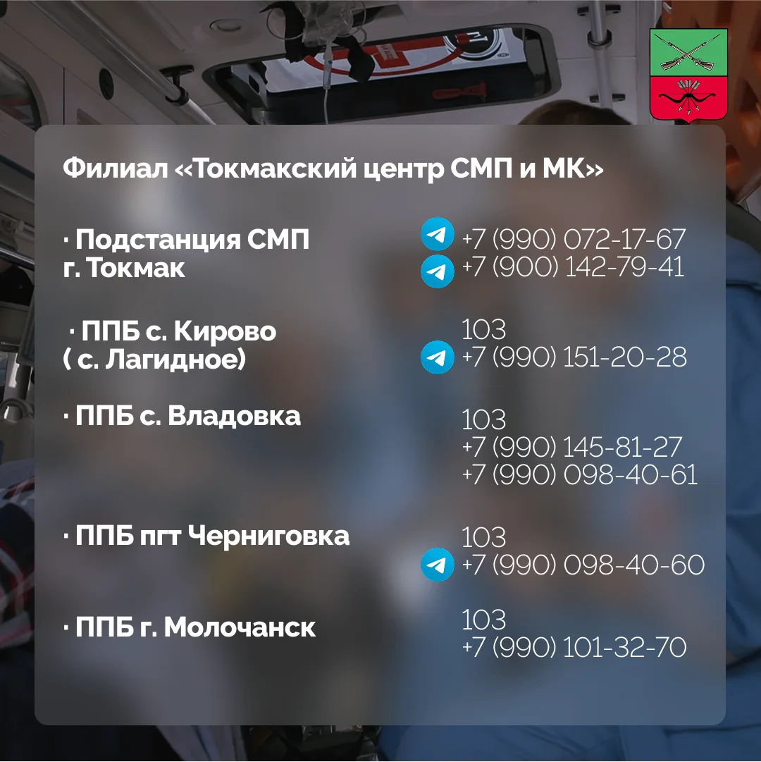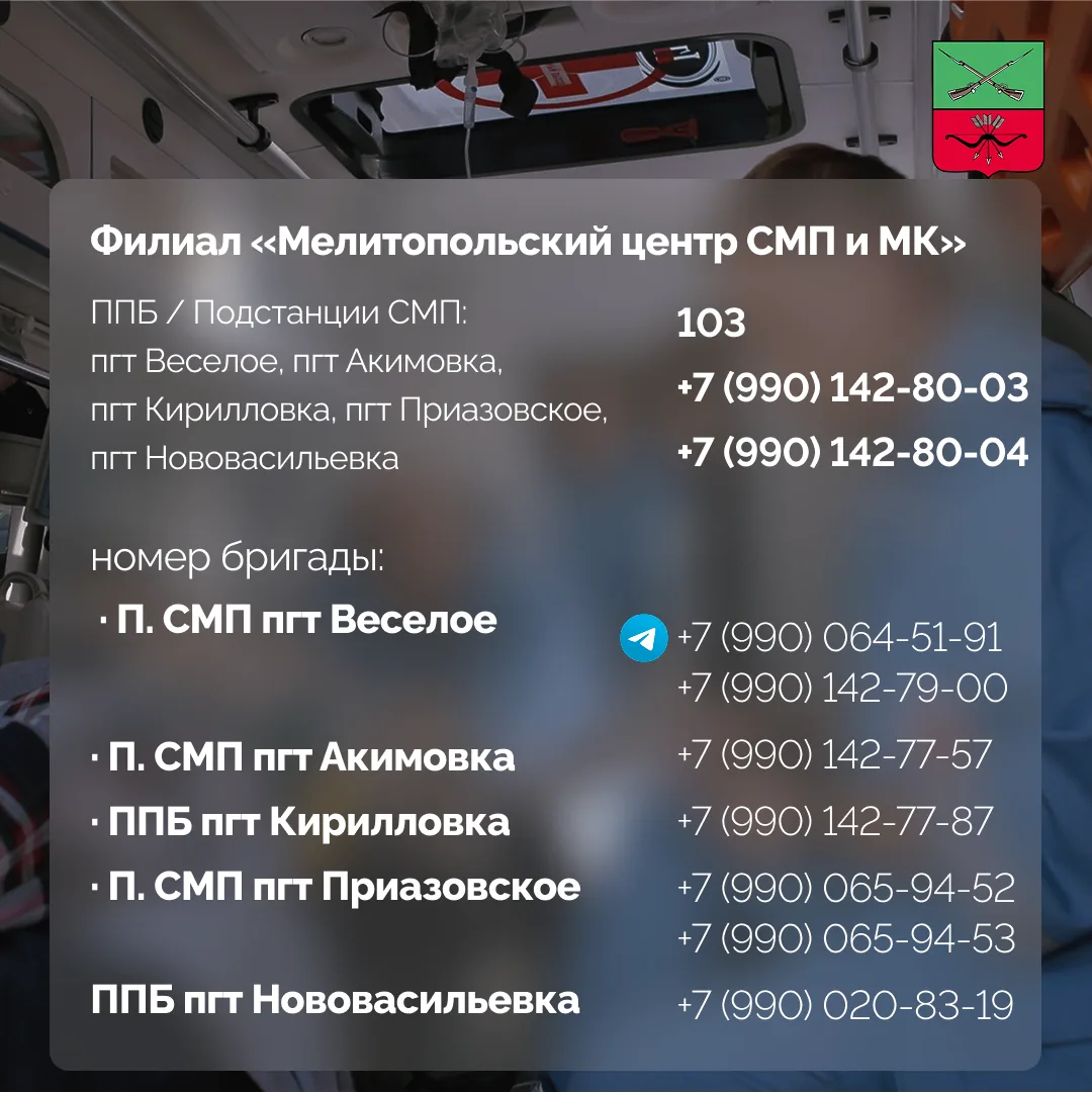 Министерство здравоохранения Запорожской области сообщает актуальные номера телефонов пунктов базирования бригад скорой медицинской помощи. В части населенных пунктов можно также связаться по вопросам оказания скорой медицинской помощи через Телеграм.