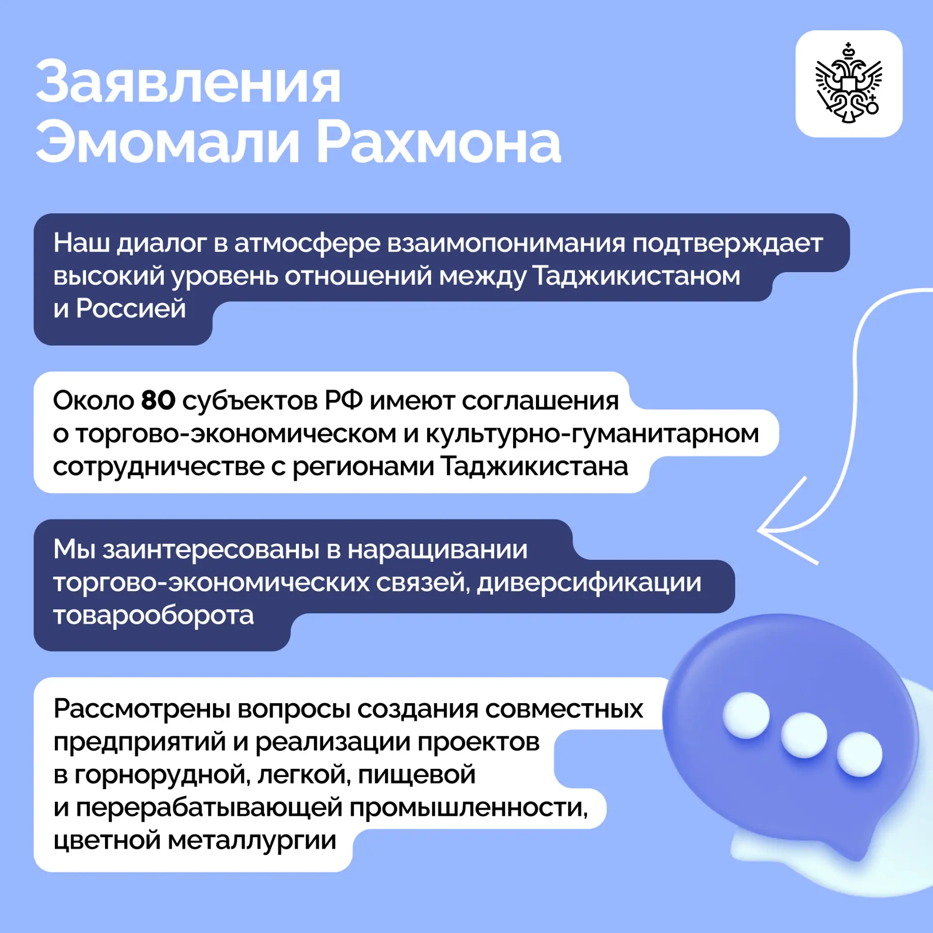 Главы государств назвали встречу содержательной и конструктивной, а состоявшийся диалог в атмосфере взаимопонимания, по их мнению, подтвердил высокий уровень отношений между Таджикистаном и Россией.