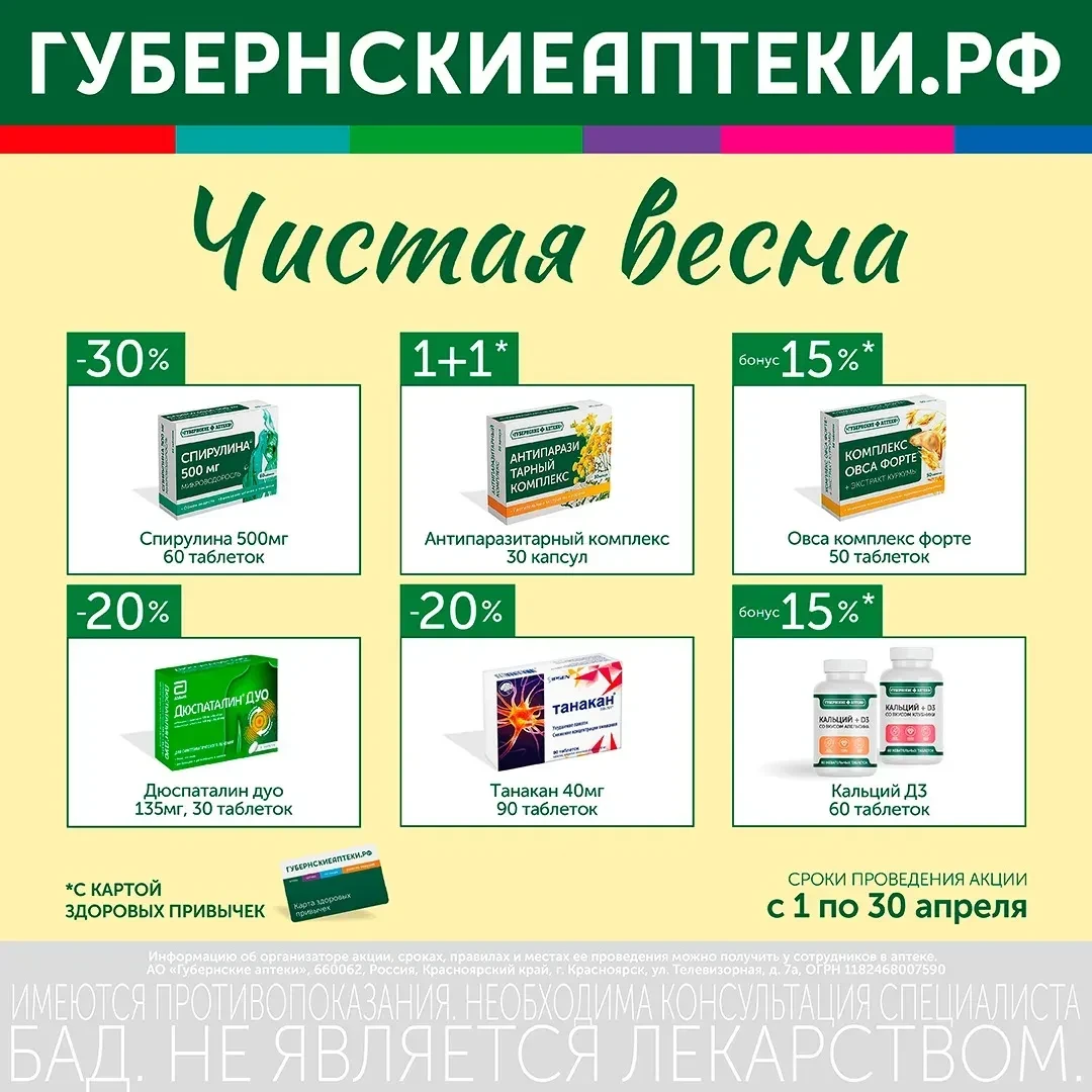 Акция проходит с 1 по 30 апреля 2026 года. Подробности уточняйте у фармацевтов в аптеках. Имеются противопоказания, необходима консультация специалистов. БАД. Не является лекарственным средством.