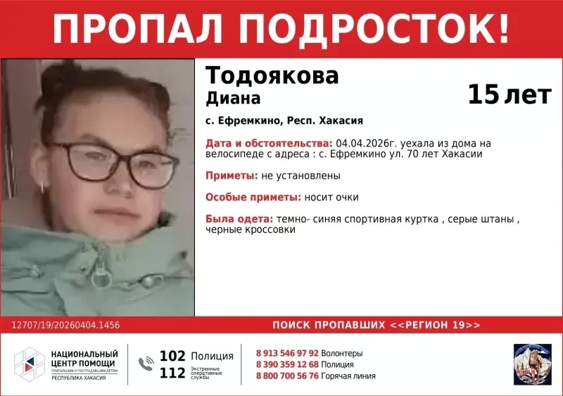 В Хакасии с 4 апреля разыскивают 15-летнюю Диану Тодоякову. В тот день девочка-подросток укатила из дома на улице 70 лет Хакасии в селе Ефремкино Ширинского района, и с тех пор о ее местонахождении ничего неизвестно. Предположительно, она может находиться на территории Красноярского края.