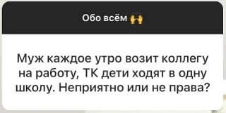 Но ситуация очень жизненная, и в этой части мне правда интересно, как вы смотрите на это? Стали бы ездить с ним на месте той женщины? А если бы ваш муж стал возить кого-то? Мм? 🤔