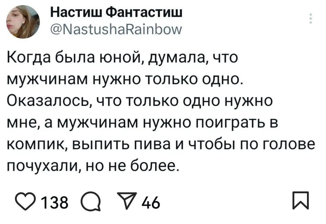 Чет даже жалко стало мужчин. Херня какая-то. Остановите землю, я сойду…