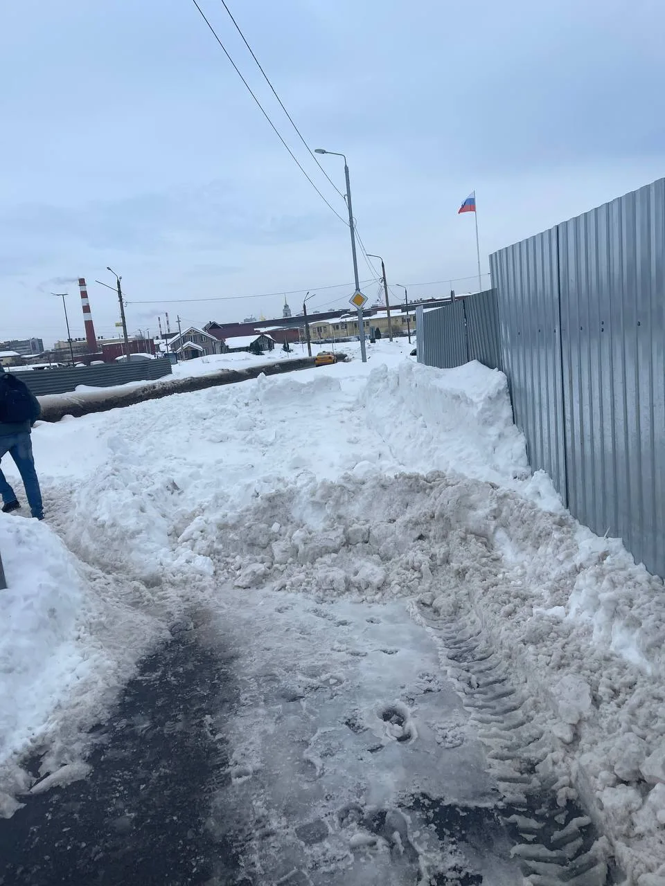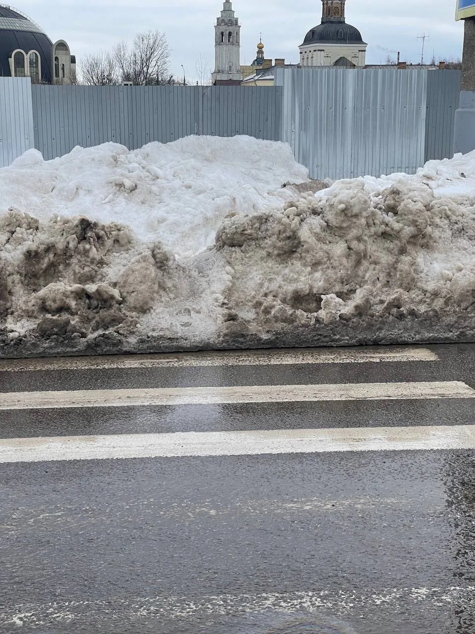 Почистили тротуар и свалили всё в огромную гору снега, закрыв доступ к пешеходному переходу. Другого пути перейти на другую сторону нет. Идти вдоль дороги с большим потоком машин — действие не из лучших и небезопасных.