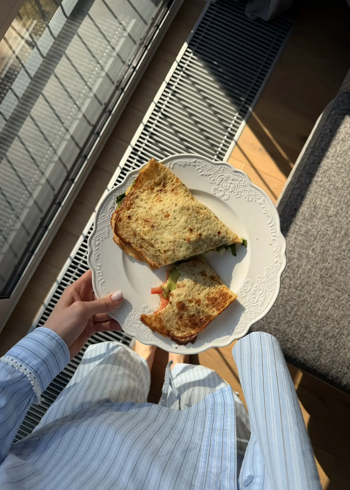 обмен утренними тарелками: сегодня — домашний, хоть я и люблю на выходных выбираться на завтраки — захотелось простого: хлеб + сыр + масло…