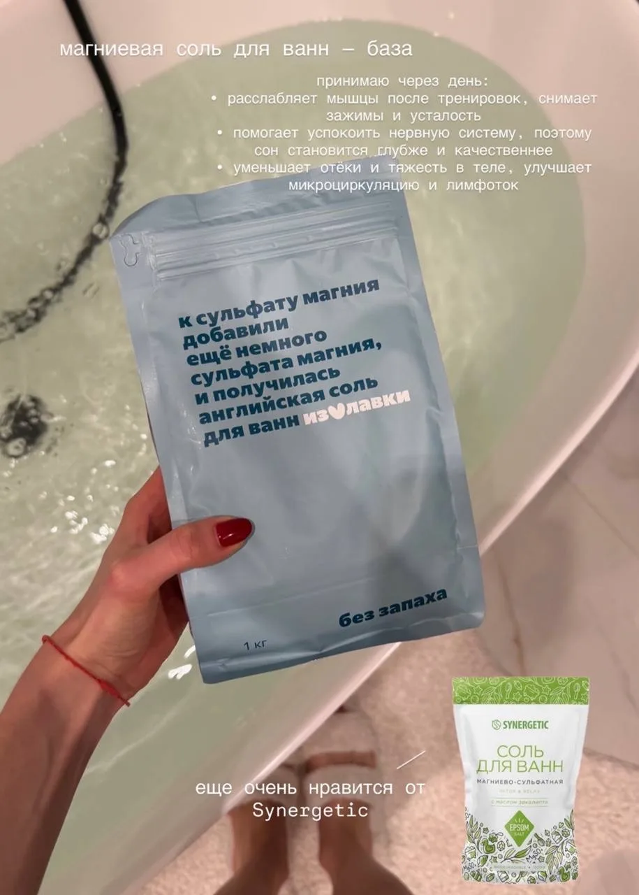 теплая ванна с солью, чаще всего с магниевой, а сегодня — голубая, с маслами и водорослями