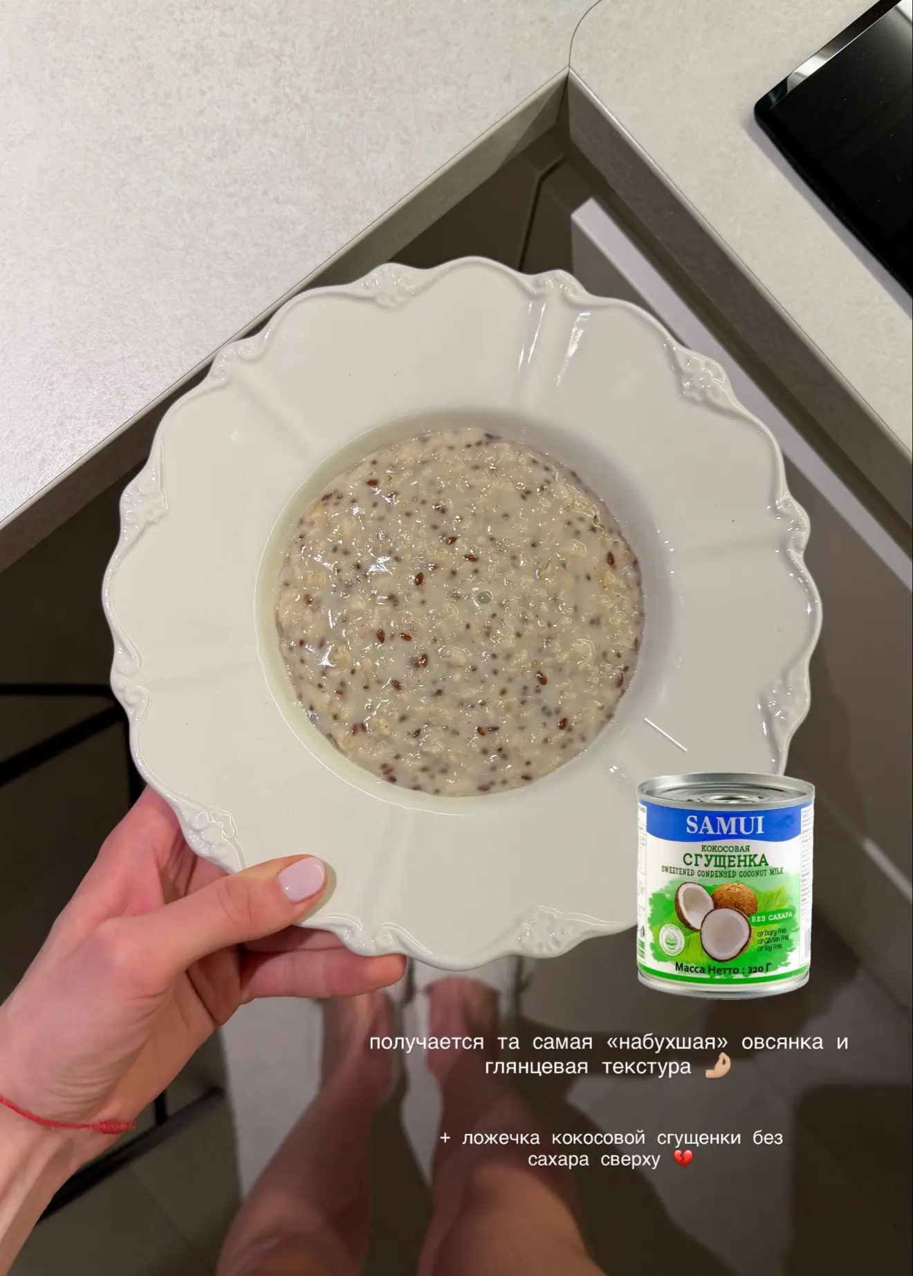 овсянку, конечно, беру долгой варки, по вкусу добавляю соль и сах.зам, а сверху ложечку кокосовой сгущенки без сахара