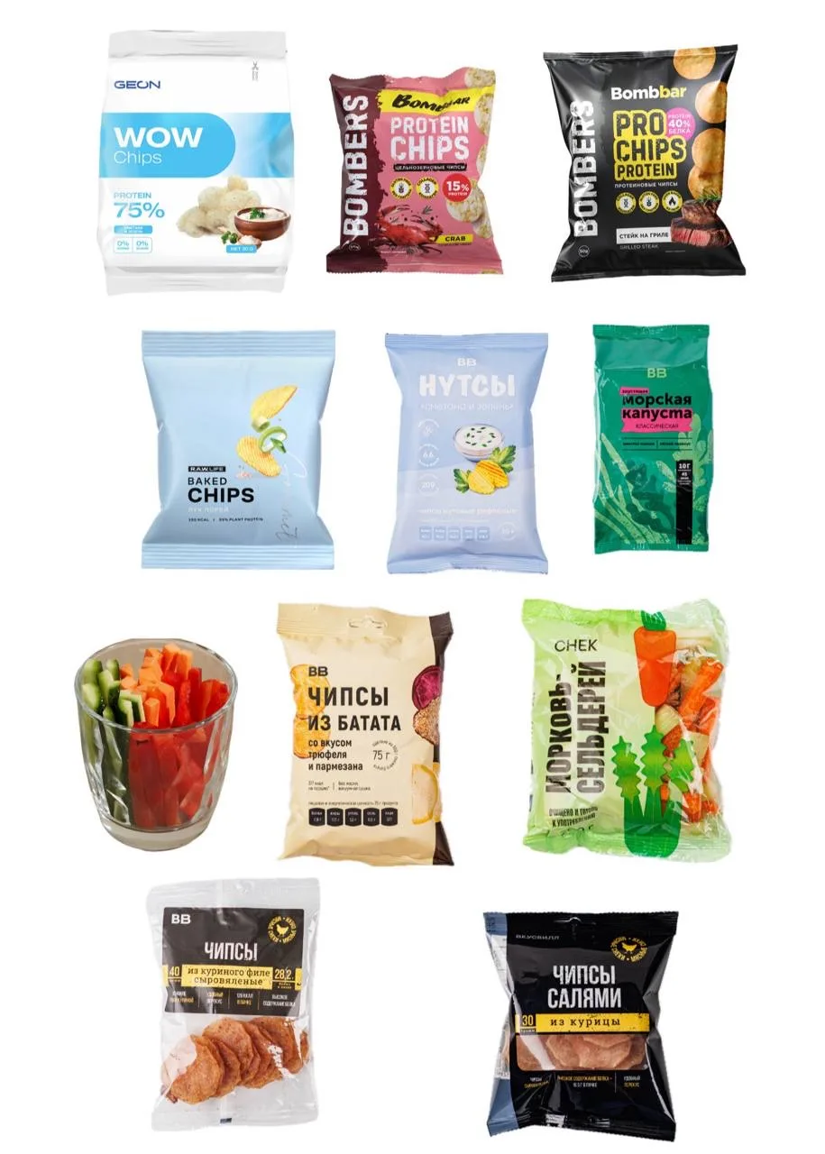 в качестве снеков можно выбирать мясные, цельнозерновые и протеиновые чипсы, запеченные и овощные варианты, добавлять нарезки из свежих овощей (сельдерей, морковь, огурец) и листы нори со специями