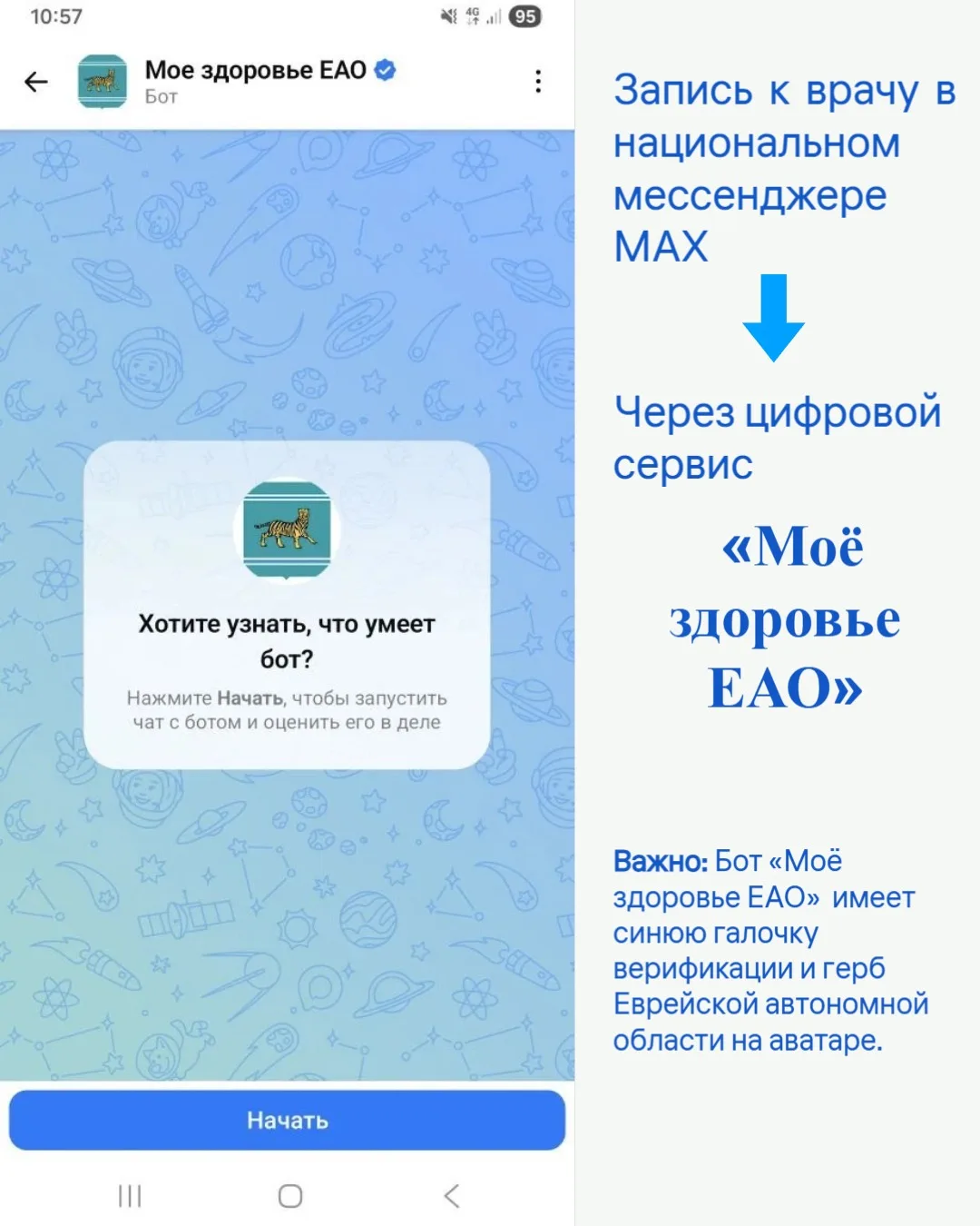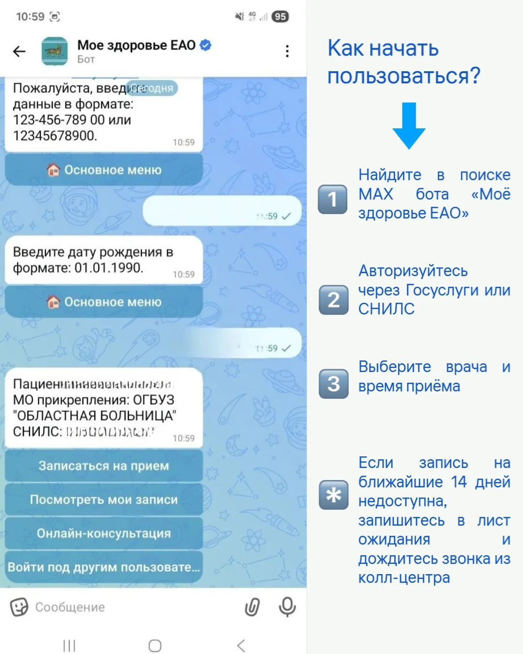 Для начала работы с сервисом пользователю необходимо найти в глобальном поиске мессенджера MAX бота «Моё здоровье ЕАО» с синей галочкой верификации и гербом Еврейской автономной области на аватаре. После запуска бота и принятия политики обработки персональных данных требуется авторизация через портал Госуслуг или ввод СНИЛС.