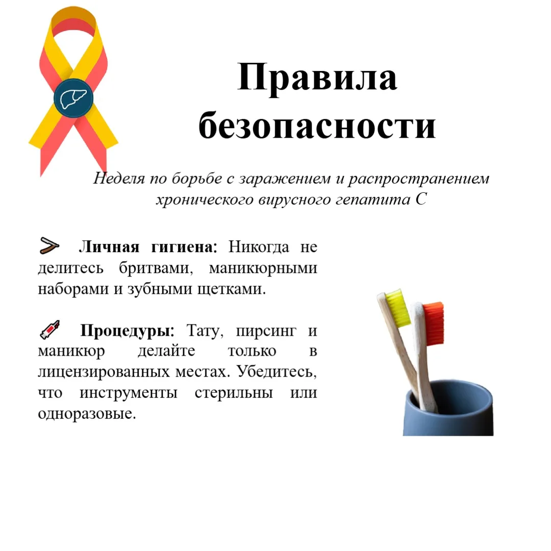 Для защиты от заражения используйте только стерильные или одноразовые инструменты при медицинских и косметических процедурах, не делитесь личными средствами гигиены (бритвы, маникюрные наборы, зубные щётки) и применяйте барьерную контрацепцию.