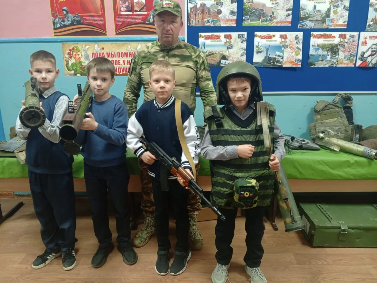 Дмитрий поделился своим опытом работы на передовой, показав ребятам выставку трофеев и фильм, снятый по дороге из "горячих точек".