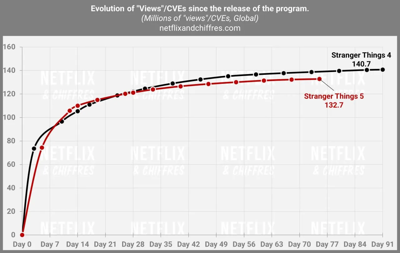 😲 Пятый сезон «Очень странных дел» не смог обойти четвёртый сезон в рейтинге самых просматриваемых проектов Netflix за стандартное 91-дневное окно подсчёта просмотров
