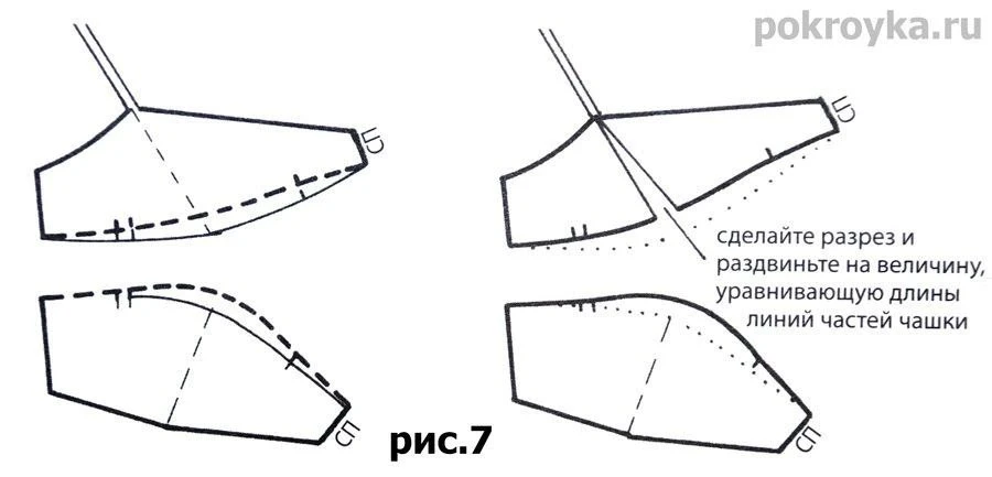 Смещение линии шва соединения частей чашки (илл.7)Чашки бюстгальтера с горизонтальными (или диагональными) швами за счет смещения линии шва, соединяющего части чашки, в сторону верхней части чашки на 1-1,5 см у точки центра груди могут зрительно увеличить высоту груди.