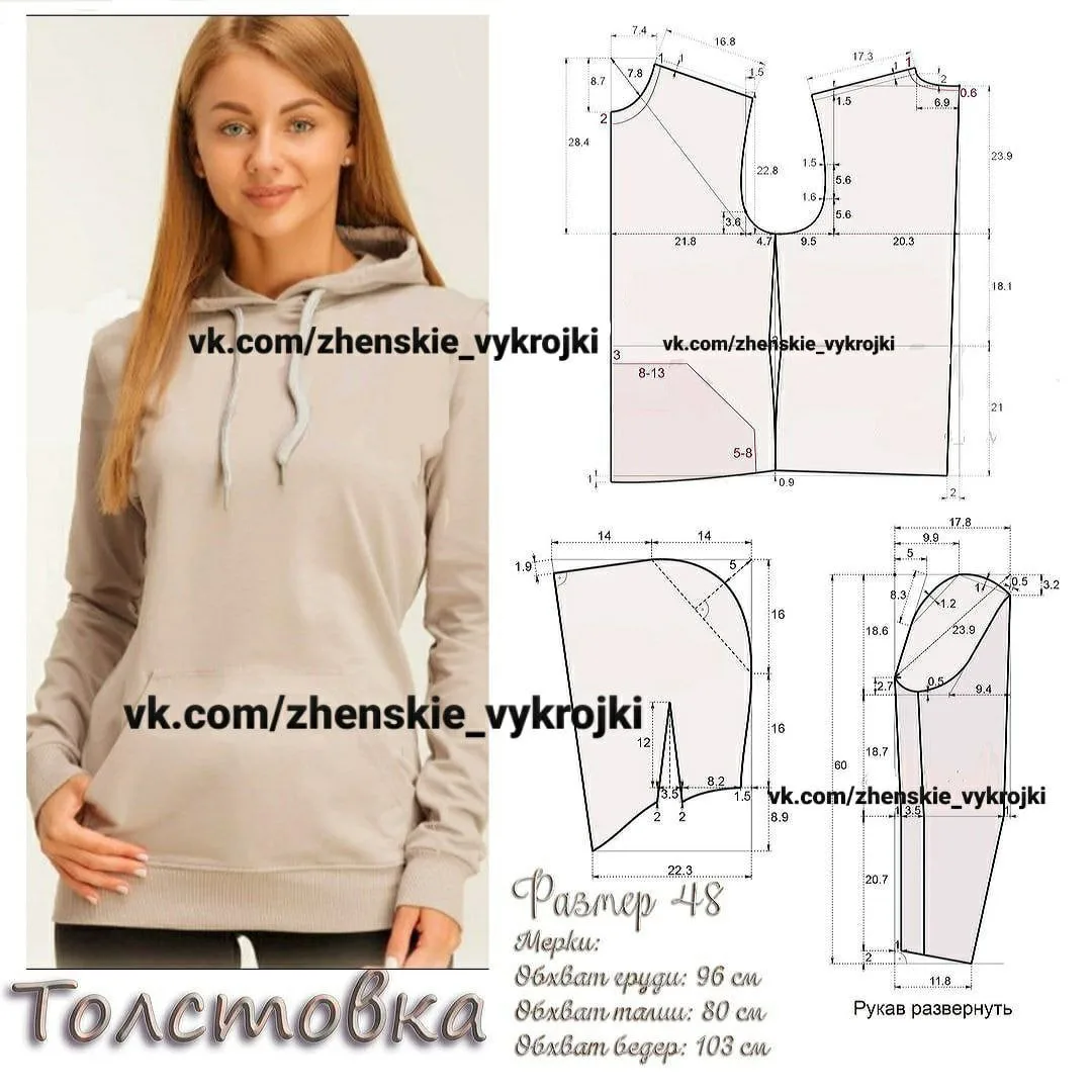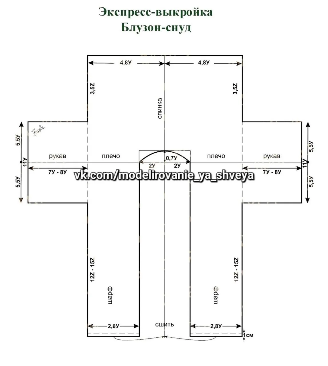 Универсальное лекало цельнокроеного блузона-снуда (полочек,спинки и рукавов) можно разложить на отрезе трикотажного полотна и сшить за час 🕰✂️📐 Z=РОСТ:34 , У= (ОГ+4):21.