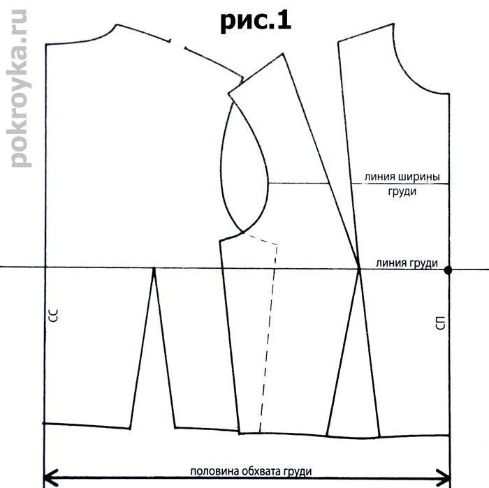 2. Отложите по линии груди от середины спинки половину величины размерного признака обхват груди. Через полученную точку начертите вертикаль - получена средняя линия переда бюстгальтера без прежней прибавки на свободу облегания базовой выкройки лифа.