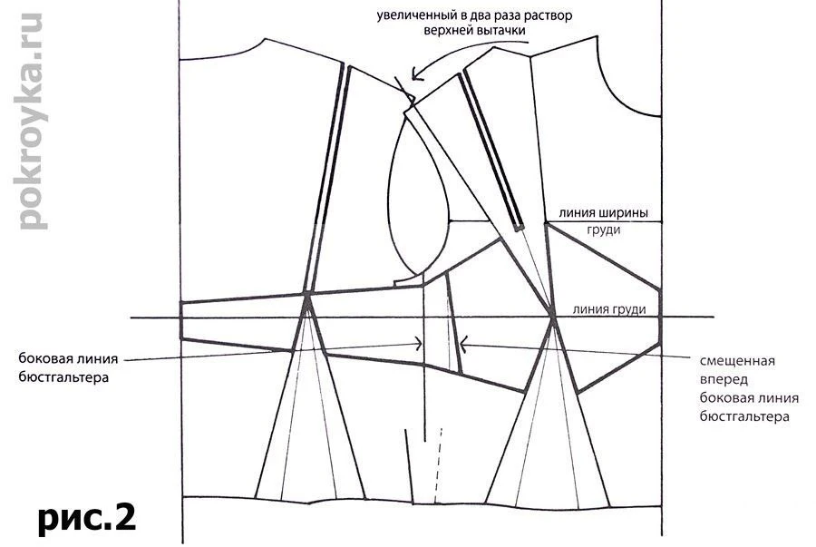 5. Начертите боковую линию бюстгальтера посередине участка, образовавшегося при наложении деталей (илл.2). Это расположение боковой линии подходит для бюстгальтеров из тонких материалов и для верхней части бикини. Для более прилегающих бюстгальтеров, с большей степенью поддержки грудных желез, используют смещенную вперед боковую линию - см. пункт 9 ниже.6. Увеличьте раствор верхней вытачки в два раза только со стороны проймы.