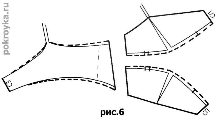 Построив исходную выкройку бюстгальтера как описано выше, мы получим бюстгальтер с размером чашки А. Если нужен больший размер чашки, к построенной выкройке (илл.5) нужно внесите изменения, как показано на илл.6, за счет которых размер чашки бюстгальтера будет увеличен дополнительно.