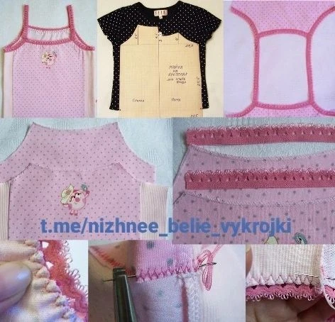 Вместо резинок можно сделать узкие бретели из трикотажа. На бретели можно использовать ту же х\б кулирку, что и сама майка, можно взять кашкорсе. Рибана для нижнего белья толстовато будет, но для летней маечки в самый раз. Получается, что мы сначала должны приметать бейку на переднюю половинку, потом уточнить на примерке её окончательную длину. И нужно учесть еще, что в процессе обработки бретель растянется, на 1-2 см точно, ну а дальше – зависит от выбранной ткани. И обязательно использовать для обработки бретелей трикотажную строчку: двойной иглой, тройной зигзаг или простой загзаг.