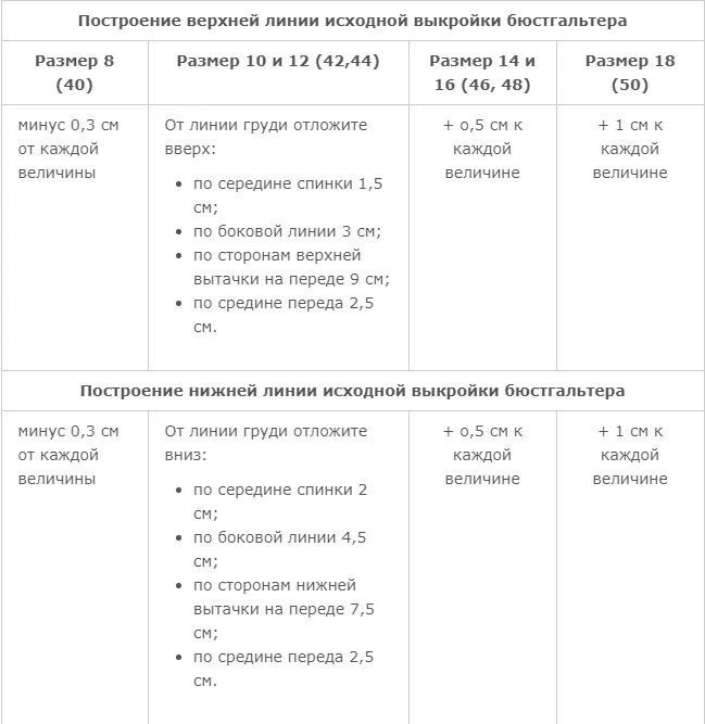7. Для определения параметров, необходимых для построения верхней и нижней линий бюстгальтера, обращайтесь к таблицам, приведенным ниже.