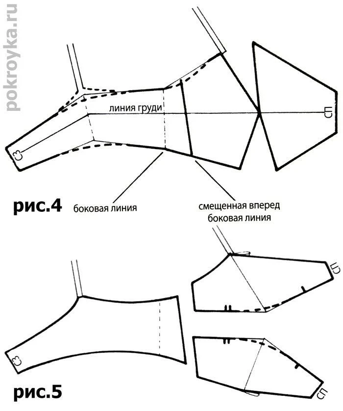 10. Скопируйте первоначальные контуры исходной выкройки бюстгальтера одной деталью (илл.4). Обведите линию груди, боковую и смещенную вперед боковую линию бюстгальтера, верхнюю и нижнюю вытачки на переде бюстгальтера. При копировании контуров бюстгальтера со спинки совместите стороны вытачки по талии на спинке.