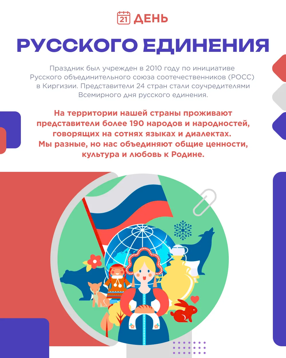 Пусть это утро зарядит вас позитивом! Сегодня мы отмечаем важный праздник — День русского единения. Эта дата была учреждена для сохранения этнических, исторических и культурных ценностей, развития, популяризации русского языка и литературы как части мирового культурного наследия. Верим в светлое будущее нашей страны 🇷🇺