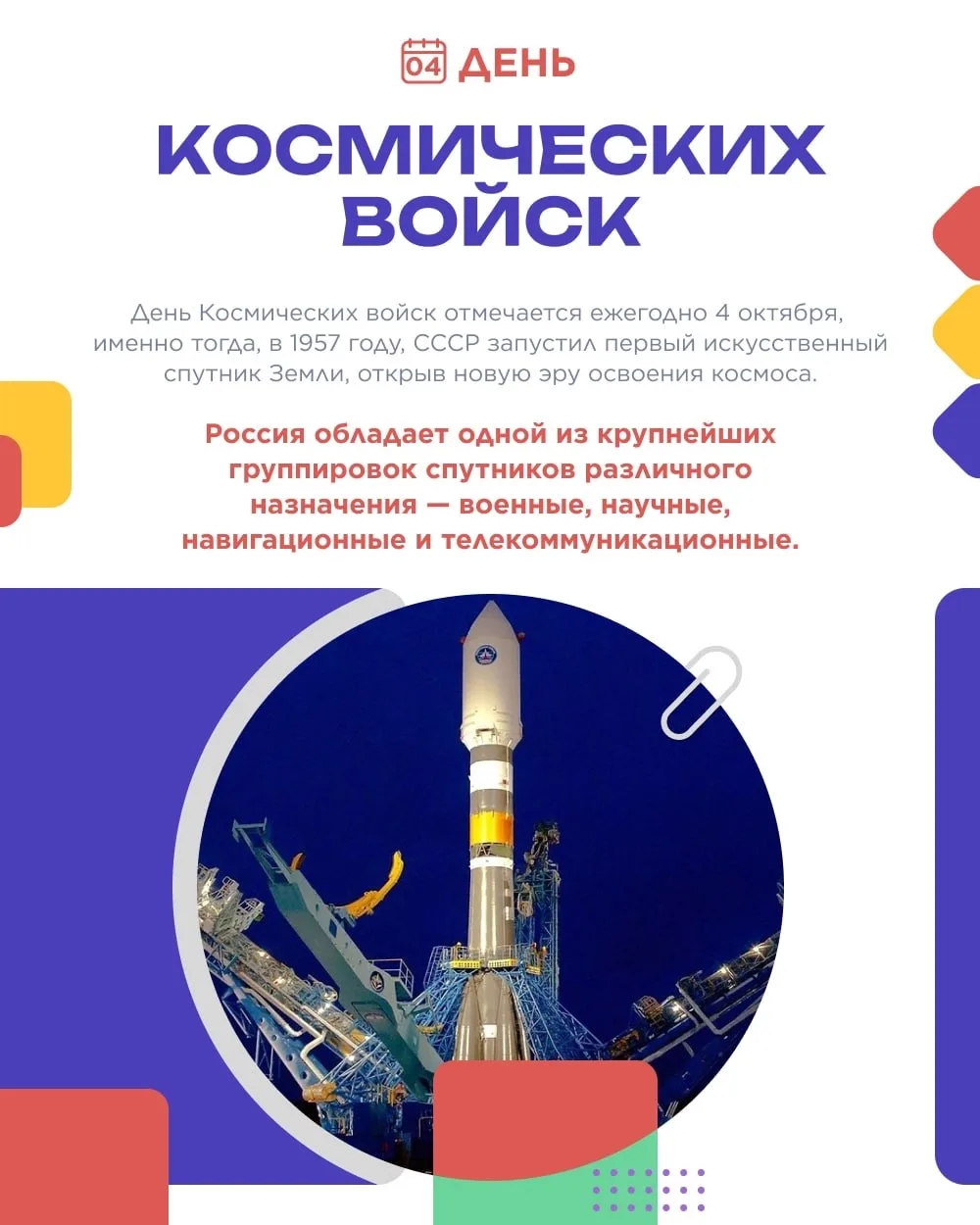 Пусть небо всегда будет ясным, а настроение космически высоким! Сегодня в нашей стране отмечается День космических войск. Этот праздник посвящается героям невидимого фронта, специалистам, чья миссия связана с космосом и защитой нашего государства на просторах Вселенной. Именно они следят за нашим небом, обеспечивая мирное существование каждого гражданина нашей страны. Мы благодарим тех, кто трудится в тени звезд, сохраняя спокойствие наших ночей и уверенность завтрашнего дня. 🚀