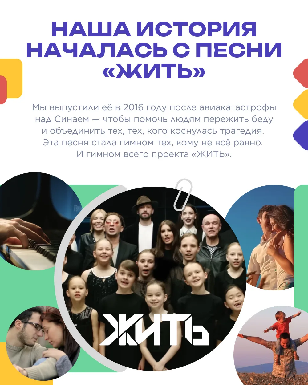 ЖИТЬ начался с песни, глубоко тронувшей людей по всей стране, и пели ее в каждом регионе. И до сих пор мы, наши герои и люди, истории которых вы услышите, выбирают жизнь каждый день. Потому что «Надо жить, просто жить» несмотря ни на что!