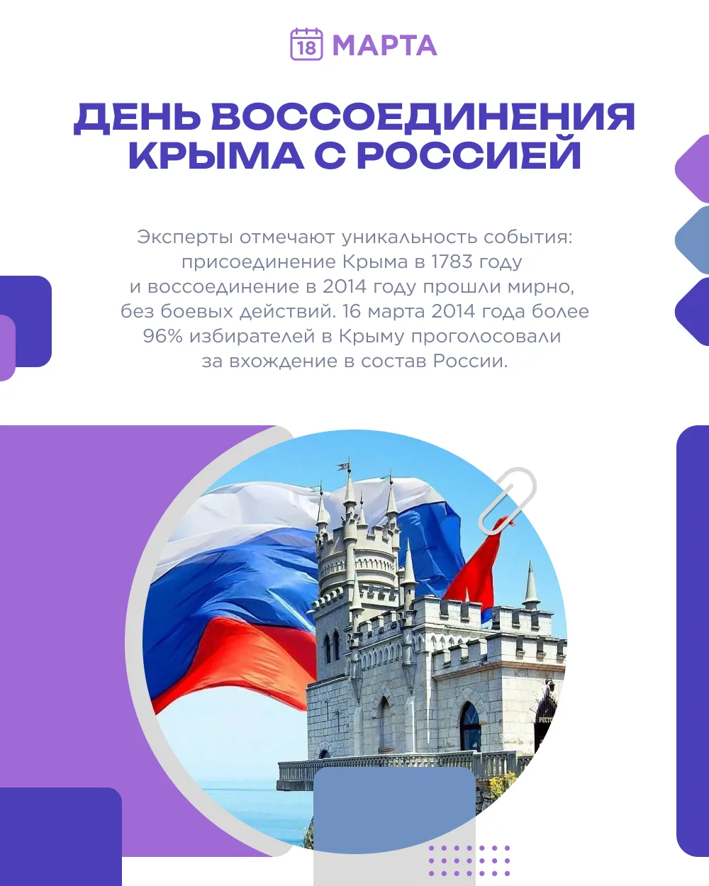 Сегодня — день, который для многих связан с памятью о важном событии: 18 марта 2014 года был подписан договор о принятии в состав Российской Федерации Крыма и Севастополя после референдума, проведённого в республике.